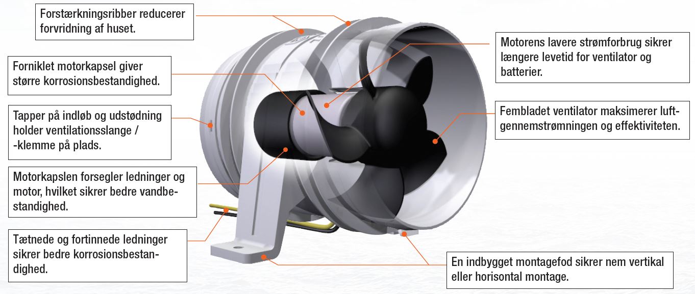 De første aksialventilatorer til motorrumsventilation udviklet på basis af luft- og rumfartsteknologi, som sikrer maksimal ydelse. Ingen andre motor-rumsventilatorer i branchen er så kraftfulde ved et så lavt energiforbrug og i en så kompakt størrelse.